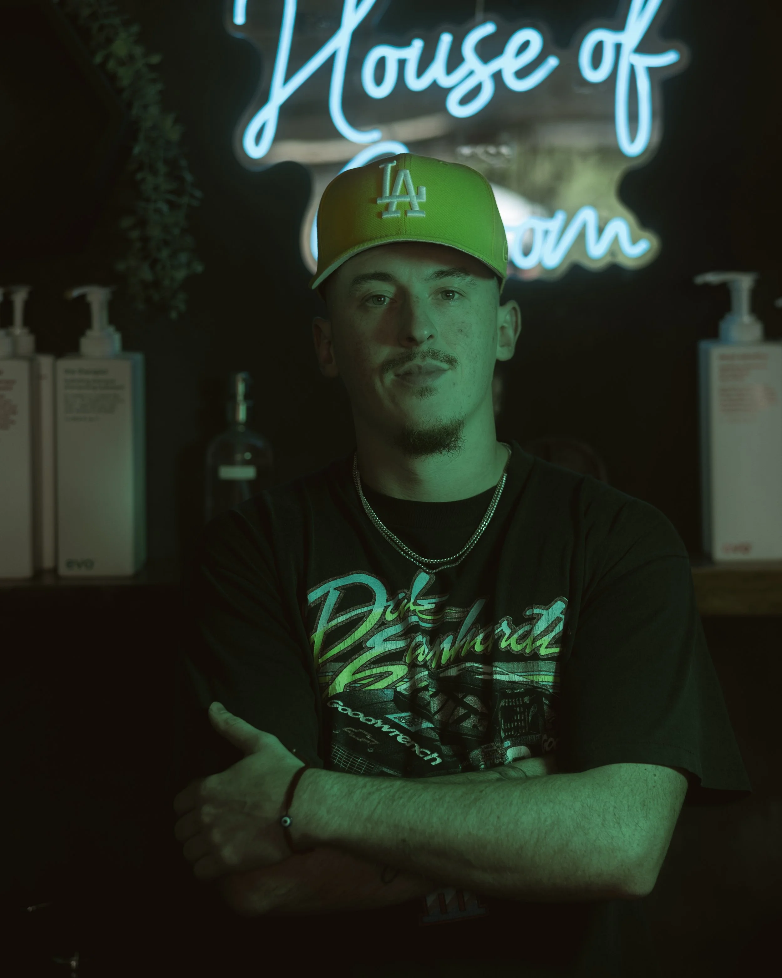 Jake is a talented and driven barber who graduated from Empire Barber School in 2024. With a background in semi-professional football, he brings the same dedication and focus to his craft. Jake has a passion for sports, sneakers, and vintage t-shirts, often snagging unique finds from his grandfather's closet. Outside of work, he enjoys spending time with his girlfriend Erika, his pit husky Enzo, and hanging out with friends over a cold Modelo.